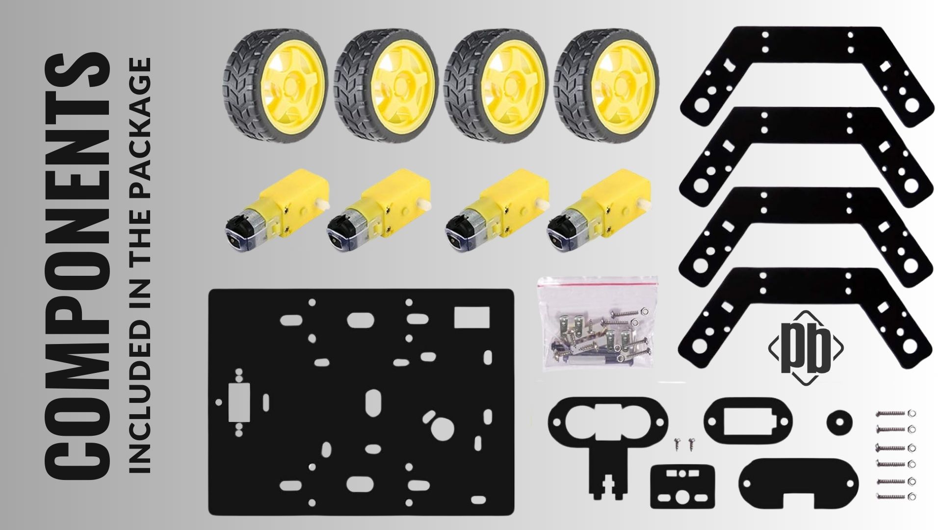 The kit contents; 1 Acrylic chassis (17.8cm X 13.2cm); 4 Acrylic Pieces for motor support4 B.O. Motors (Double shaft, Straight); 4 B.O. Wheel (Wider Wheel, Dia=6.5cm, Width=2.5cm) Acrylic parts for Ultrasonic Holder and servo holder; Screw, Clamp, Spacer and nut-bolt pack